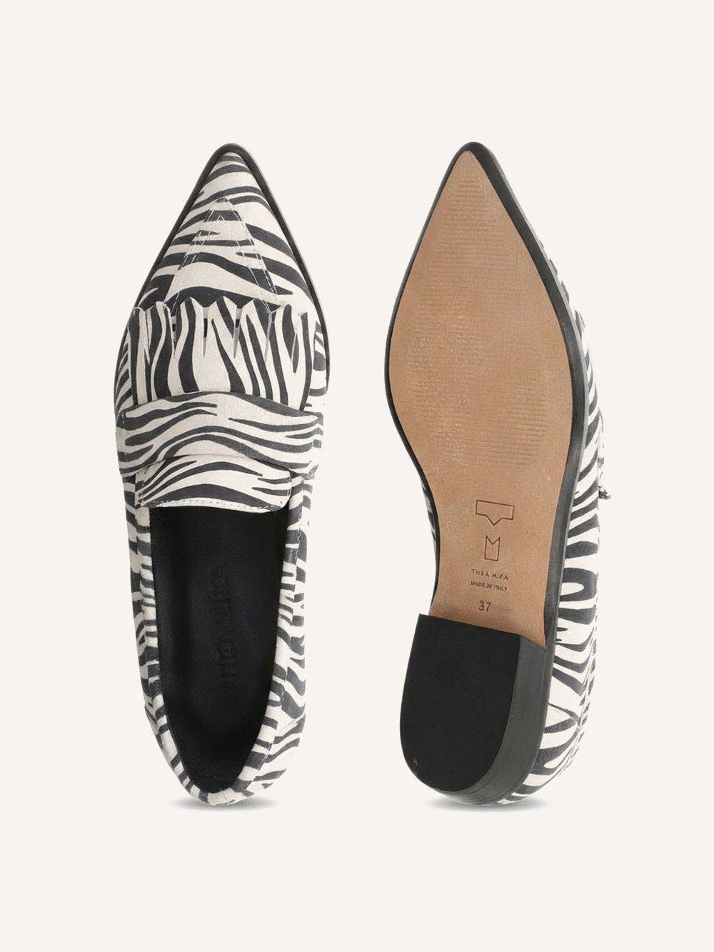Kaffeehaus-Akzent: Der Thea Mika MIOKO Loafer MIOKOXX-0097-0081 in BIANCO NERO zeigt cleanen Minimalismus mit feiner Silhouette; Obermaterial aus Leder mit Zebra-Print, innen weiches Lederfutter und Lederdecksohle und eine Laufsohle, die griffig und alltagstauglich bleibt; Die Passform wirkt easy zum Reinschlüpfen und bleibt dabei angenehm leicht – passend für Frühling und für Wege durch die Stadt und den Feierabend; Für einen runden Mix sorgen Thea Mika OPRAH Loafer (OPRAHXX-0002-0351) und Thea Mika OXANA Loafer (OXANAXX-0002-0351).